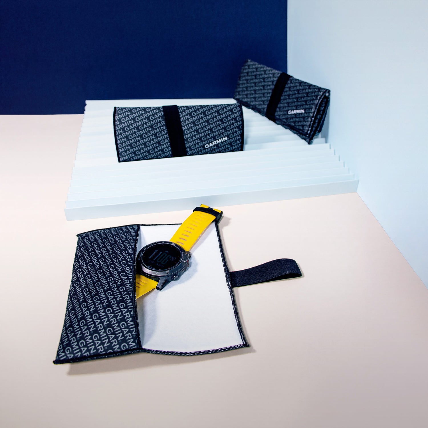 Desde Garmin se comunican con nuestro departamento comercial y de desarrollo de producto para encontrar el que más se ajuste a sus necesidades: guardar y proteger sus relojes. Así, testearon con muestras de productos y encontraron un nuevo uso a nuestras fundas universales acolchadas de 7,5x18cm para gafas. Unas fundas muy versátiles y multiusos, súper adaptables con goma elástica, que tienen la doble función de limpiar y proteger.