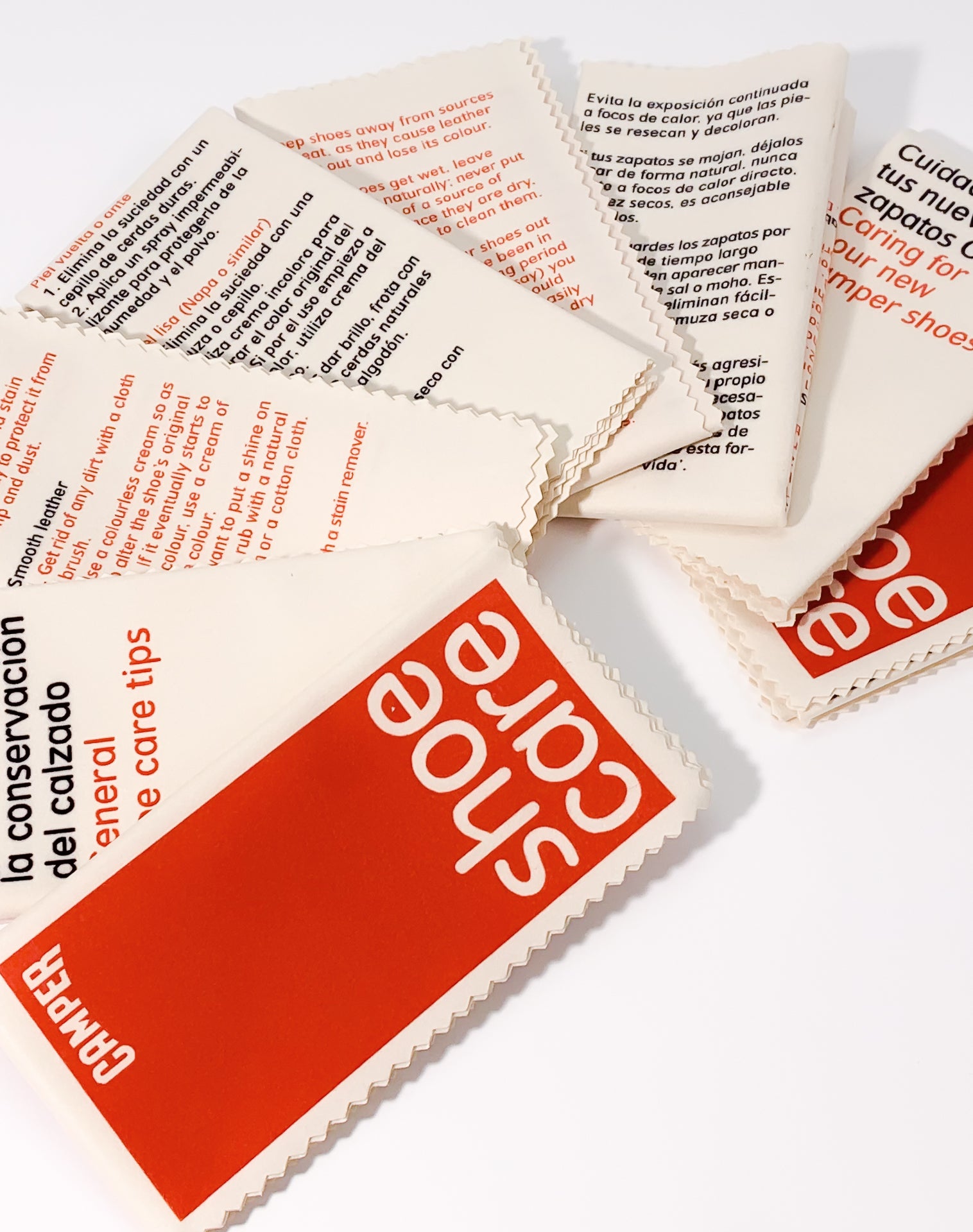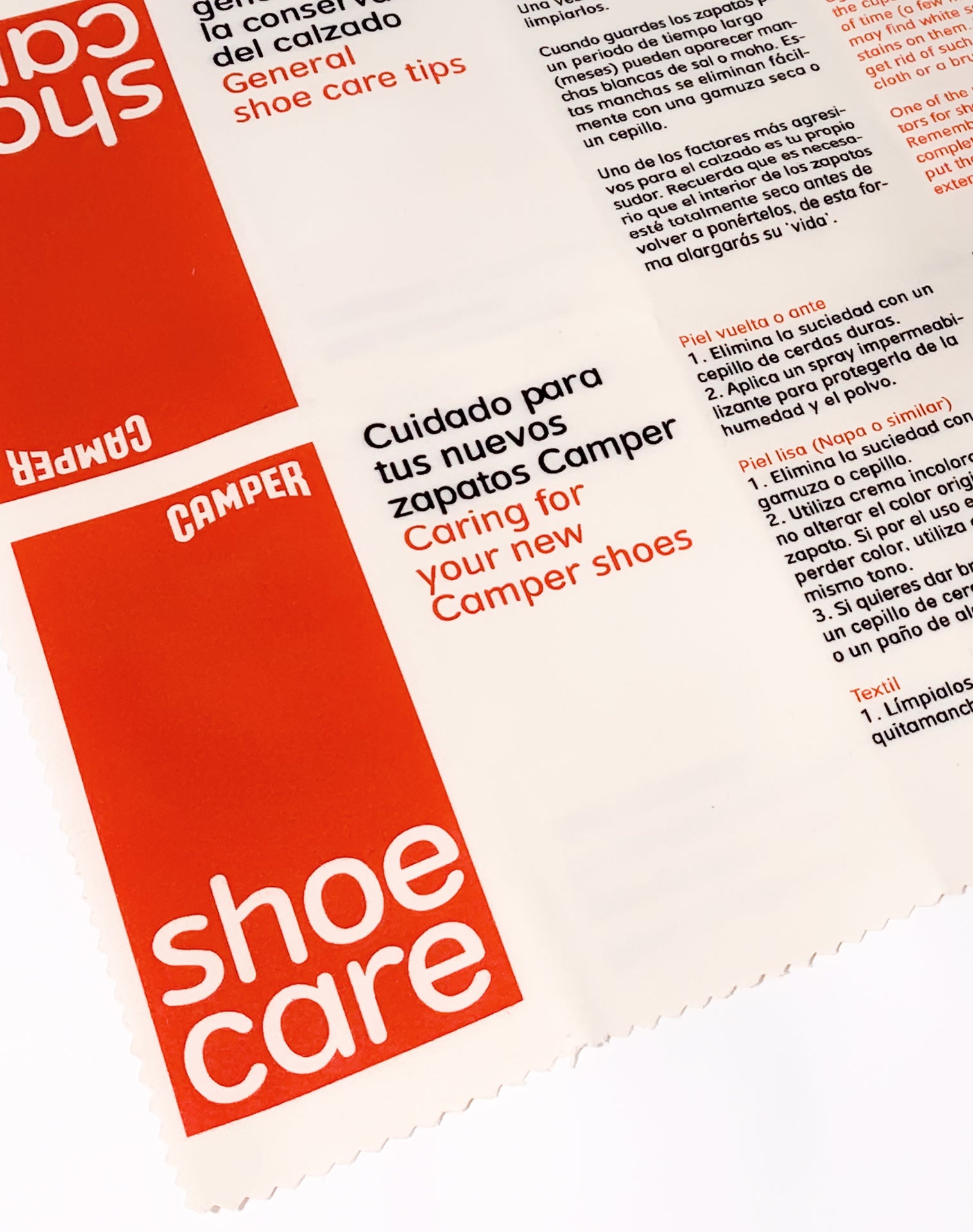 Camper ens va trobar quan buscava un material de qualitat per a les seves noves camusses. La microfibra no era gaire coneguda aleshores, però nosaltres ja en sabíem els grans avantatges: netejava i polia més, no contaminava l'entorn i es podia rentar més vegades. Així, Camper va decidir fabricar els seus nous fulletons informatius en microfibra.