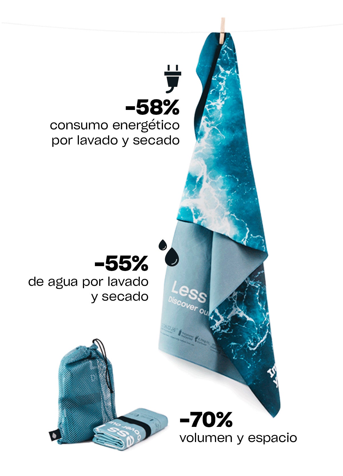 Les nostres tovalloles de microfibra estan fetes de 100% polièster amb 30% de rPET reciclat.