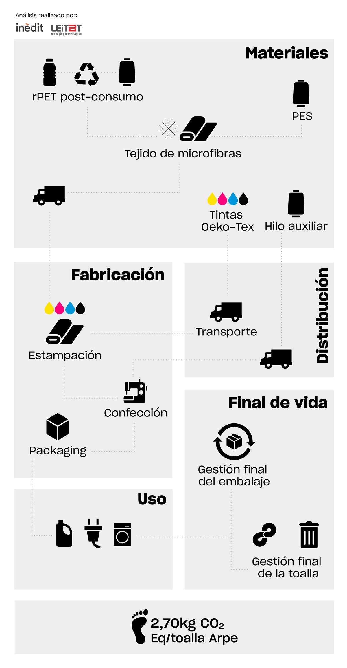 Així, Inèdit i Leitat ens van presentar una anàlisi del cicle de vida de la nostra tovallola de microfibra, segons la ISO 14040-44: 2006. Per a aquest, es van tenir en compte cinc etapes. -