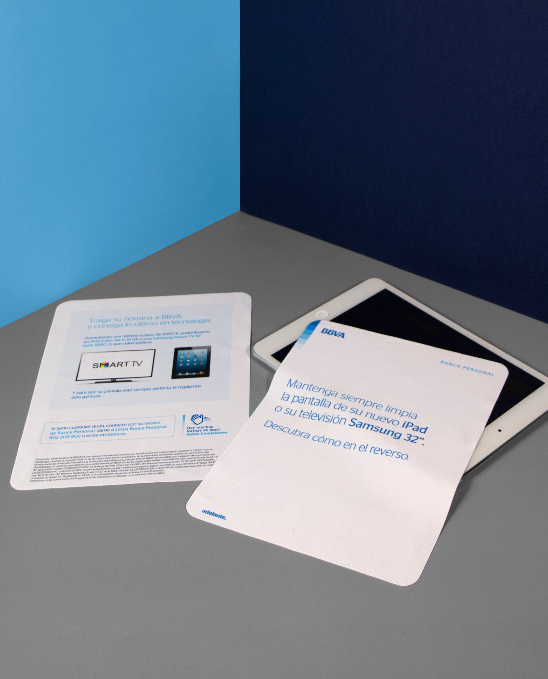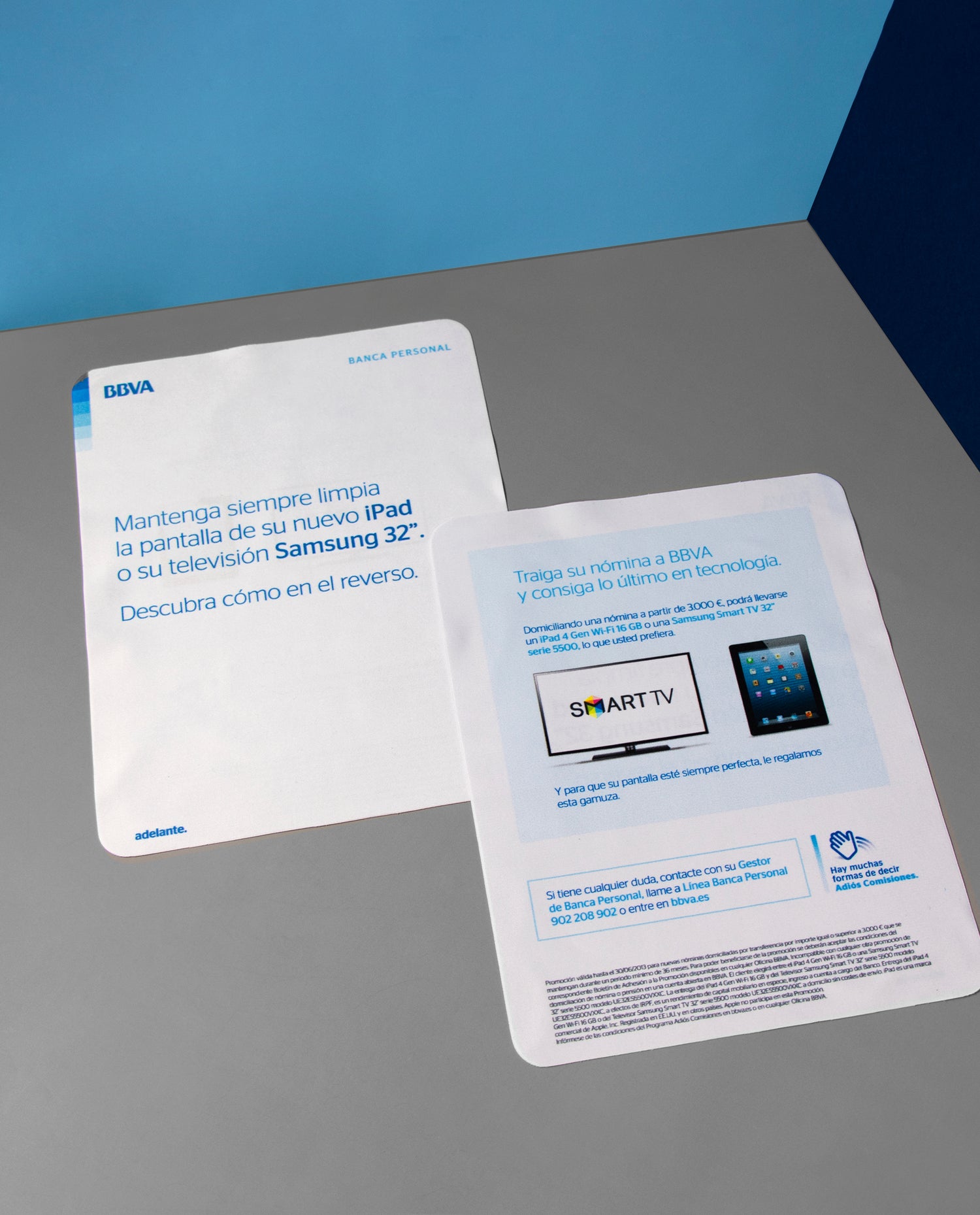 BBVA wanted to innovate with its new customer acquisition campaign, in which they gave away an appliance to anyone who set up their salary to their bank. Thus, at Arpe we thought our iPad cleaning cloth, 16x21cm, was the perfect product: durable, surprising, and super useful for cleaning these appliances.