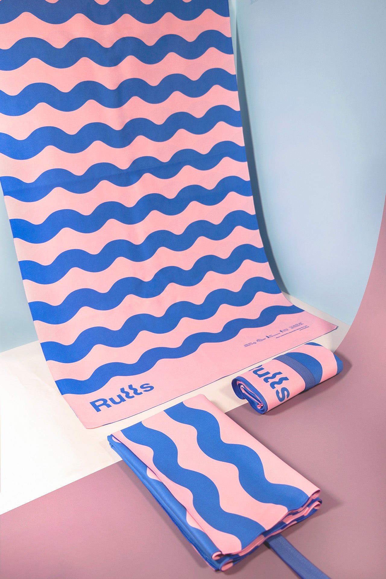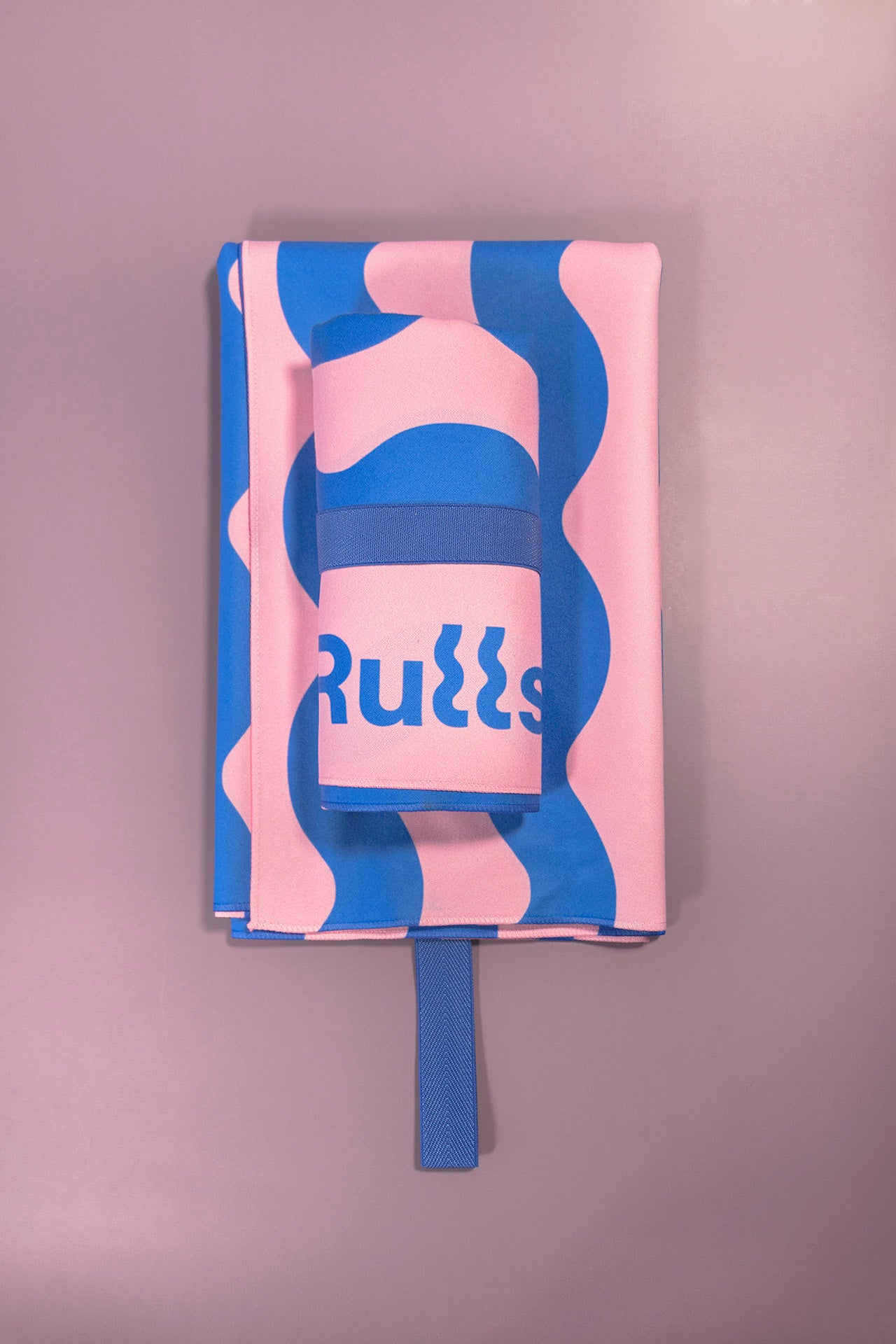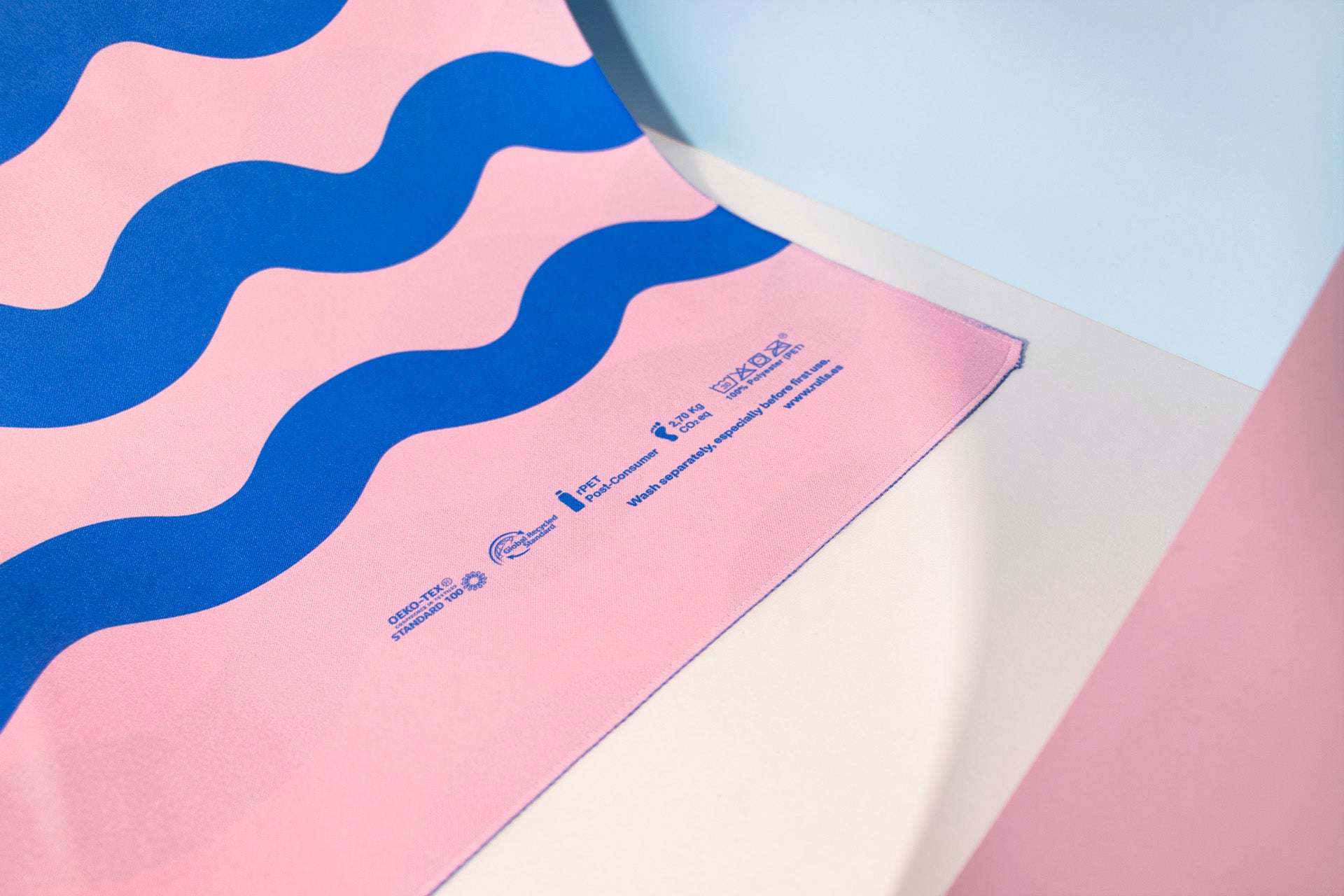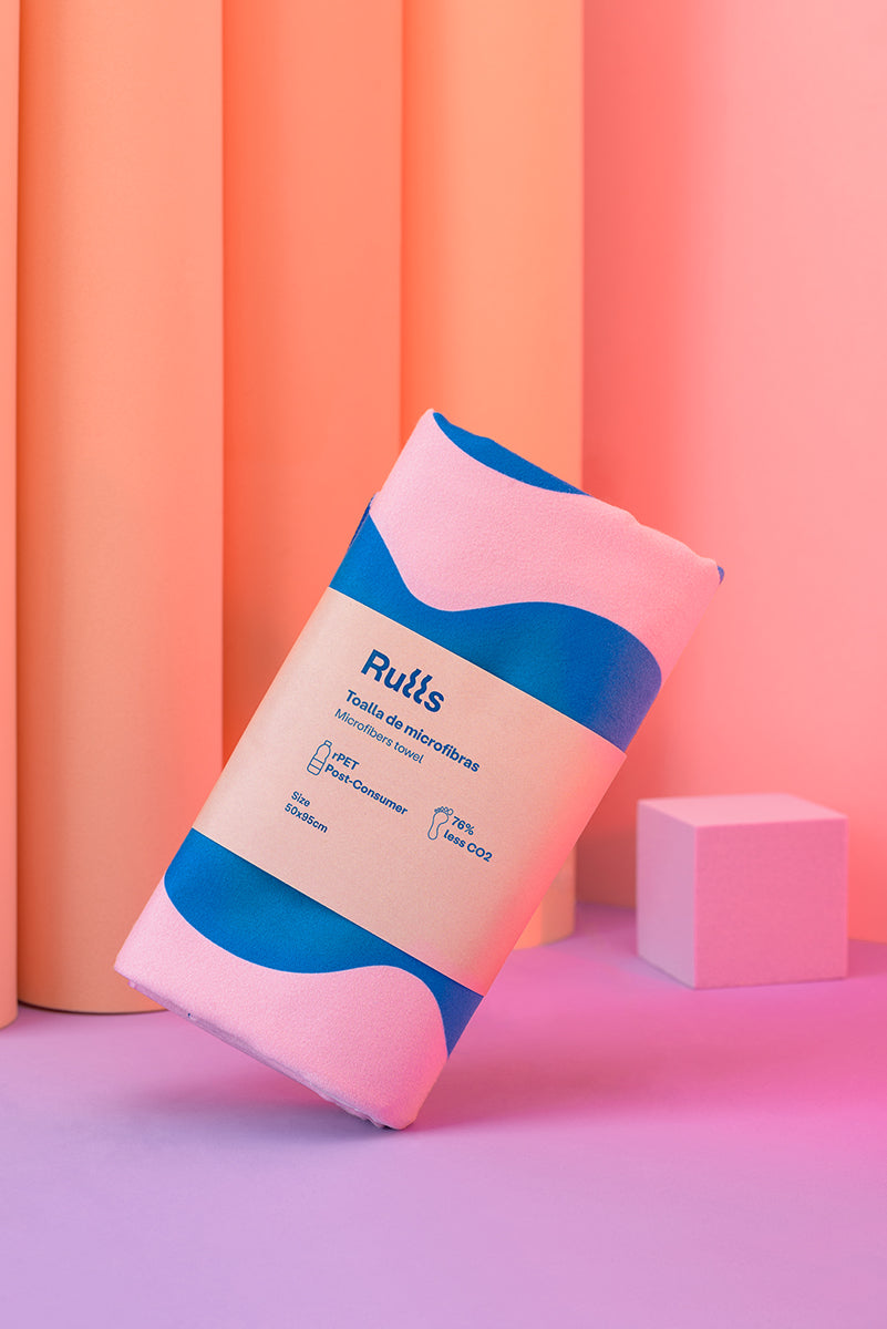 Rulls wanted the towels digitally printed in their own design, double-sided with his two-ink print (PANTONE 7455 C and 182 C). Thus, our internal design department added the logo and all the necessary information on washing, composition and certificates (which they decided to print on the towel itself instead of on a separate label, a more sustainable option). In addition, they wanted to add the elastic band in PANTONE 2746 C and wrap it in a recycled paperband. And this is how we sent it.
