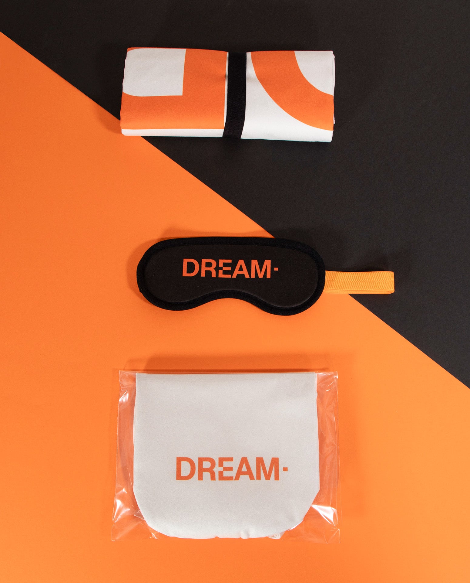 What started as a single personalized towel evolved into a three-pack of products. A microfiber towel (75x126 cm) with single-sided digital printing and elastic band, for the welcome kit. And a eye mask and travel neck pillow in digital printing for the goodbye kit.