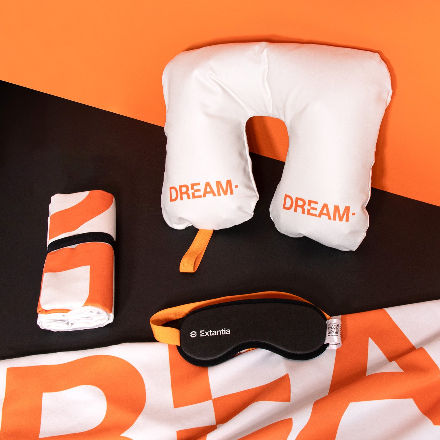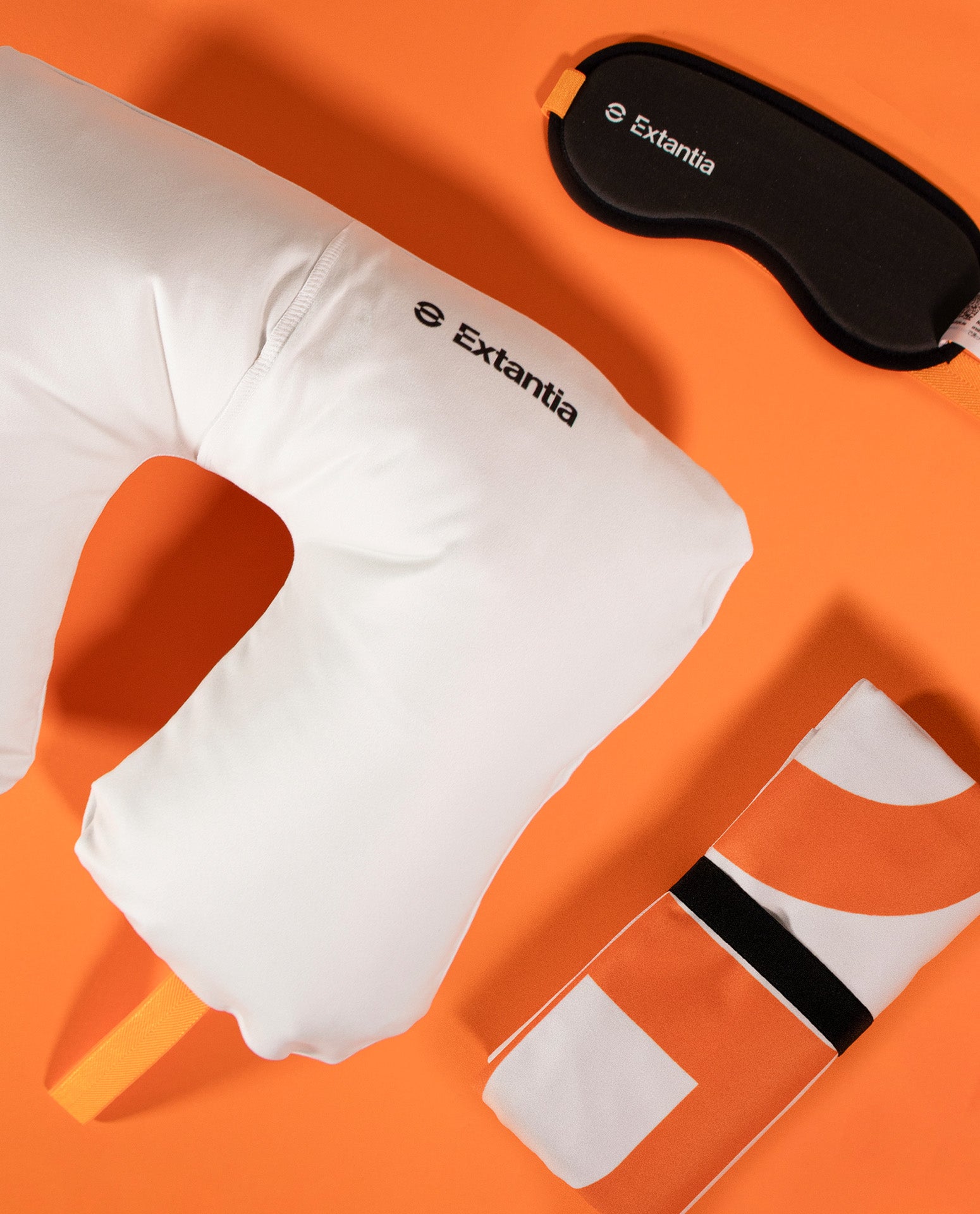 We've created a custom microfiber towel, a travel pillow, and an eye mask for the welcome and farewell kits of Extentia's company retreat.