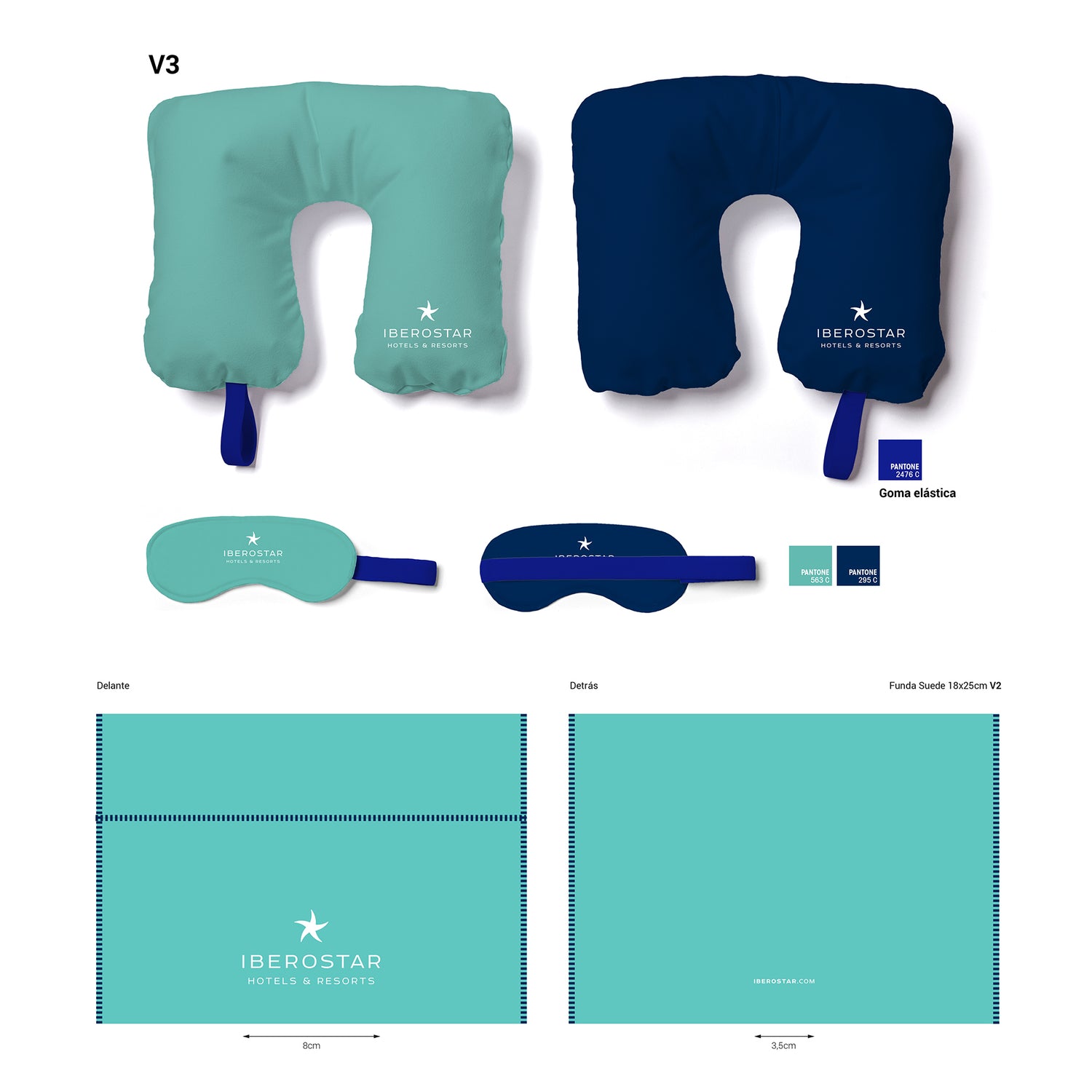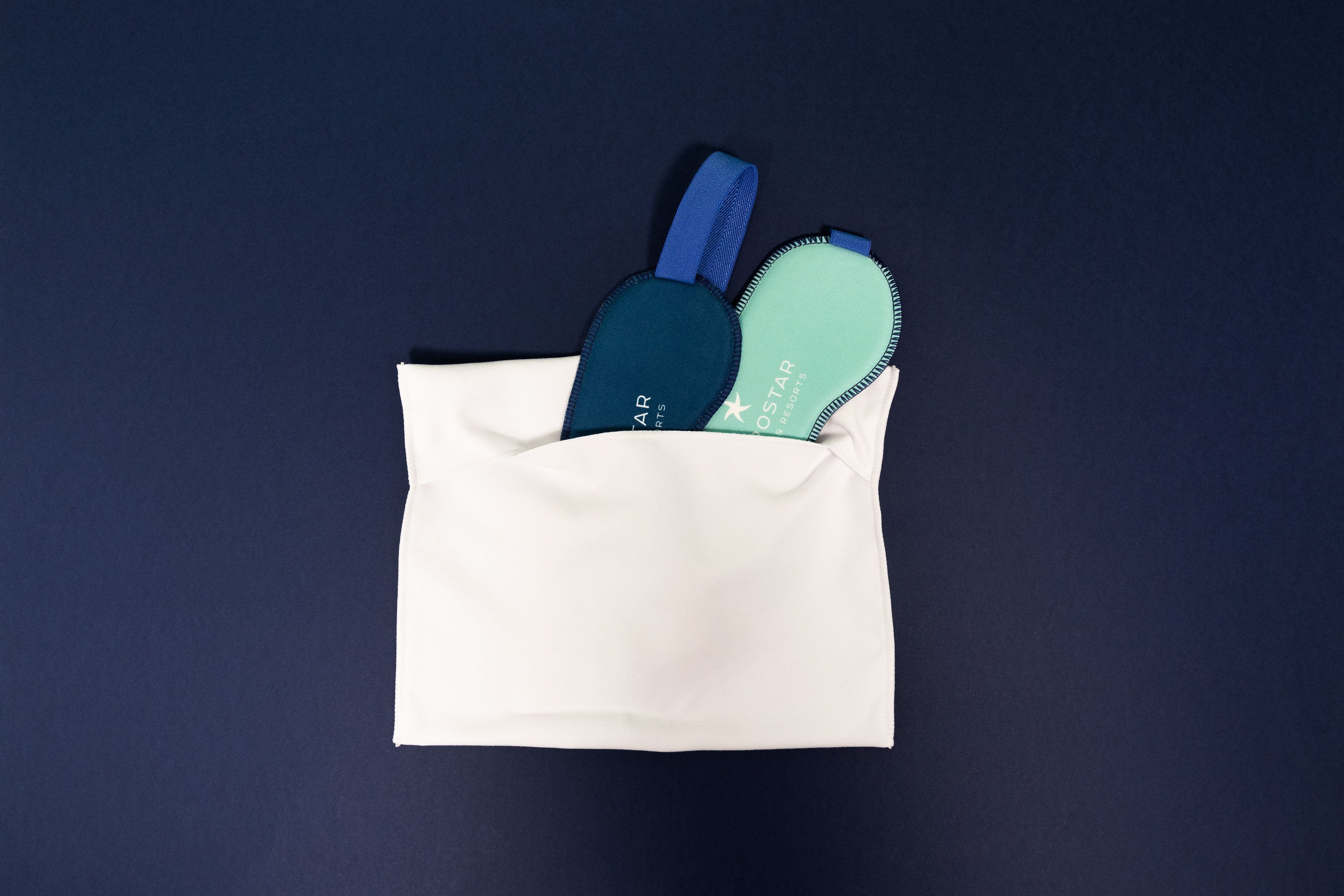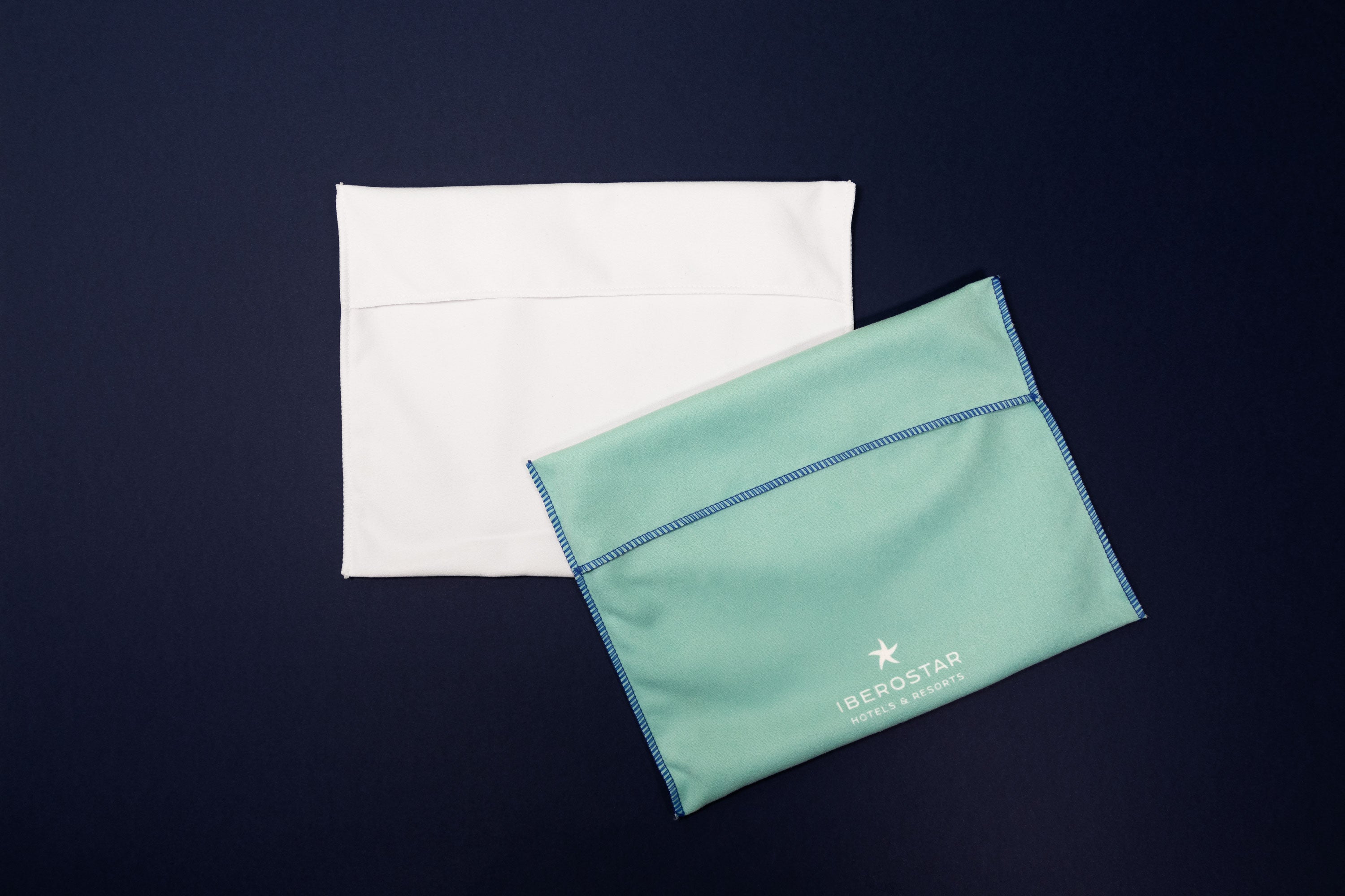 Our in-house Design Department coordinated with Iberostar to create products that best represented their corporate image. Finally, these were digitally printed in both sides, in navy blue and turquoise blue, with the logo in white.