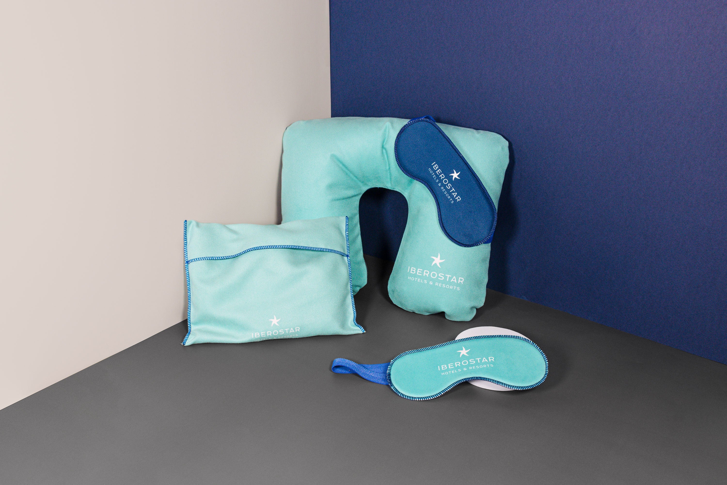 We've created a custom microfiber towel, a travel pillow, and an eye mask for the welcome and farewell kits of Extentia's company retreat.