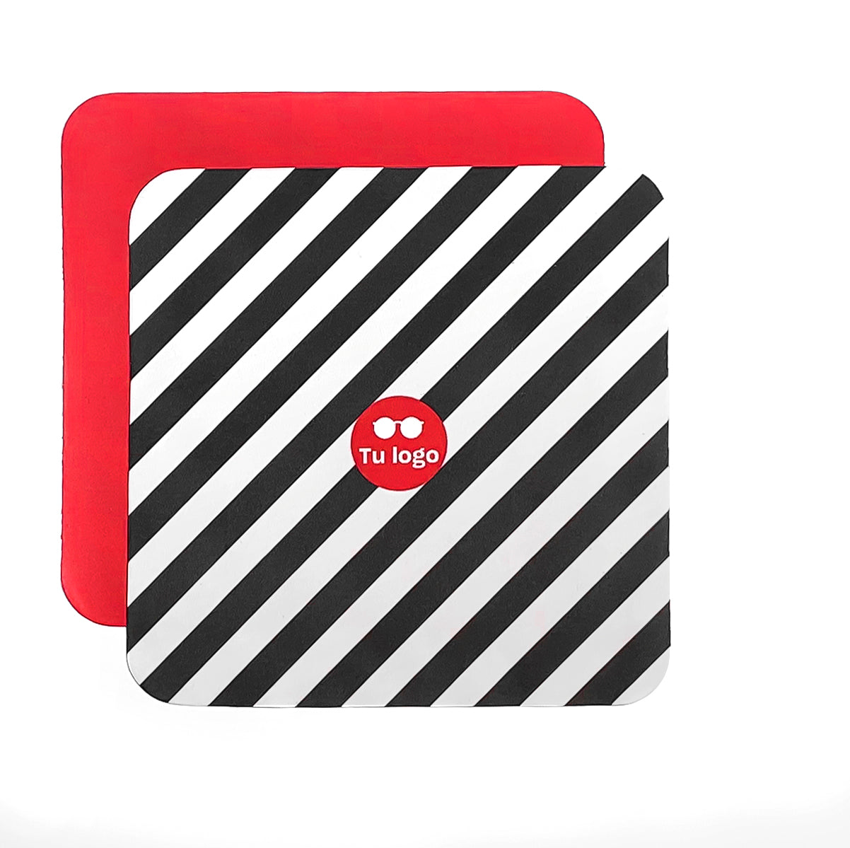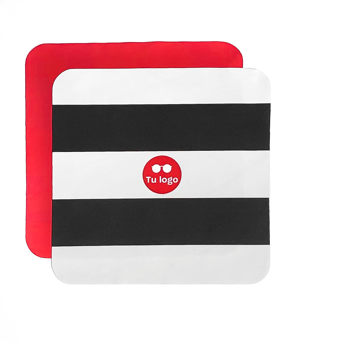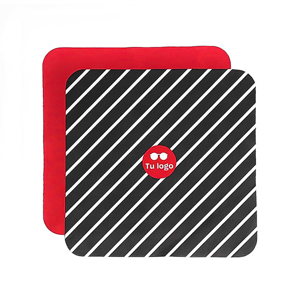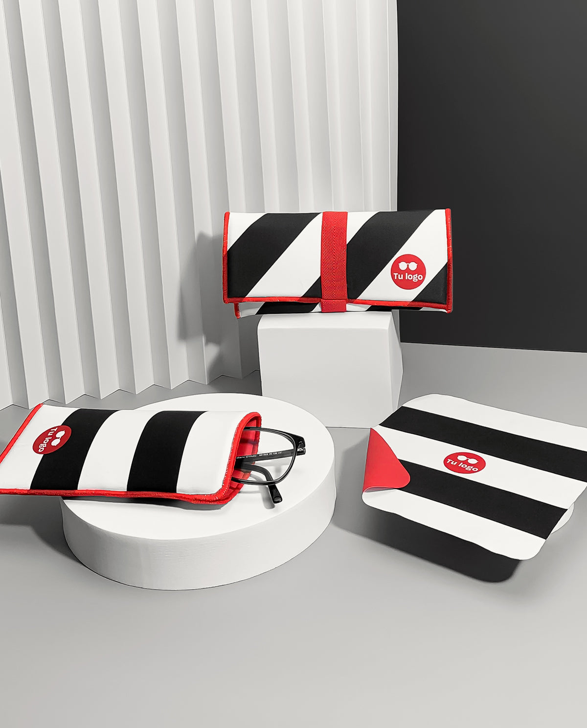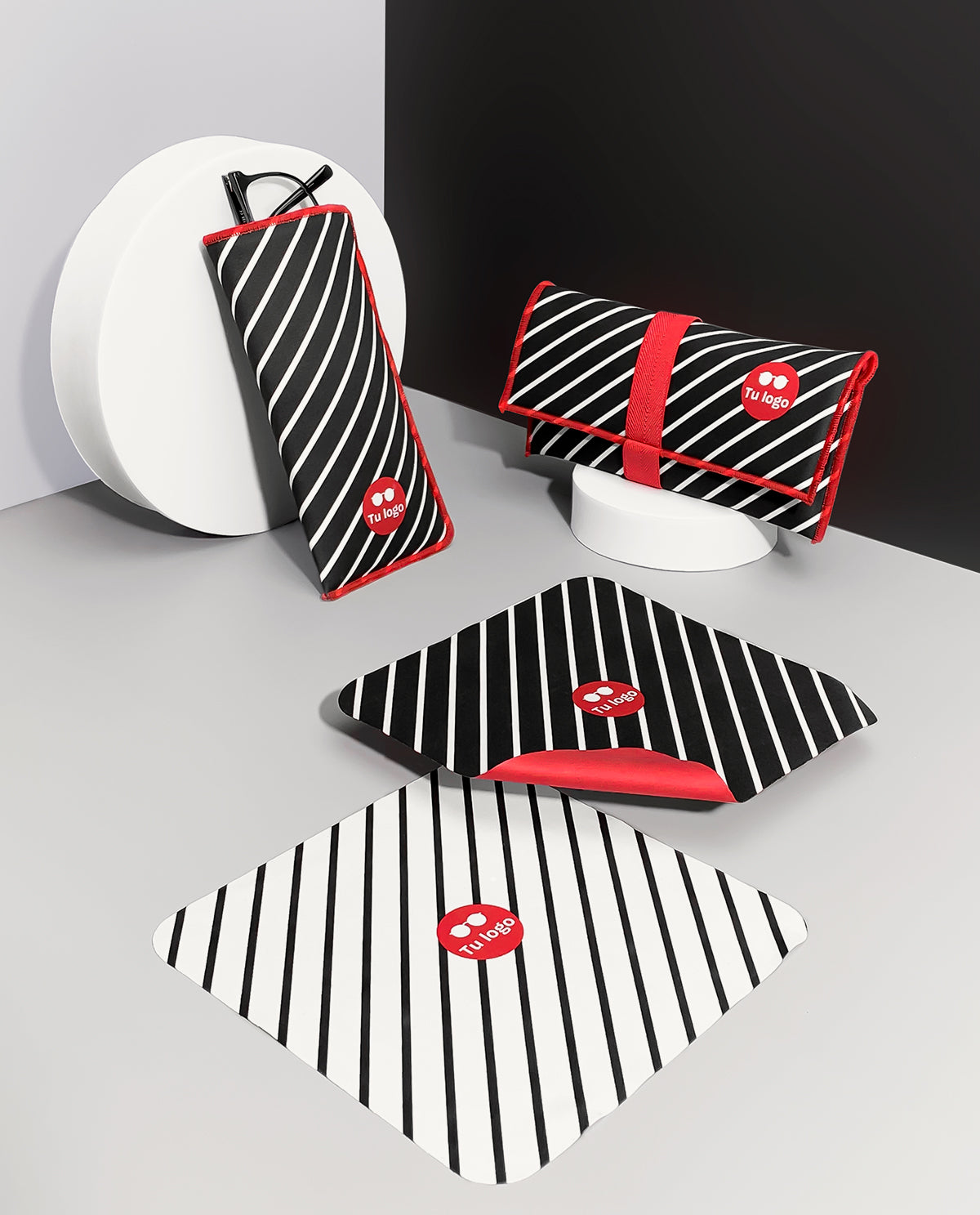 Clean and minimalist, the Black & White collection is ideal for your optician shop, with the possibility of customizing it and adapting it to your needs. Glasses sleeves and cleaning cloths in high quality microfiber and printing, available in different versions.