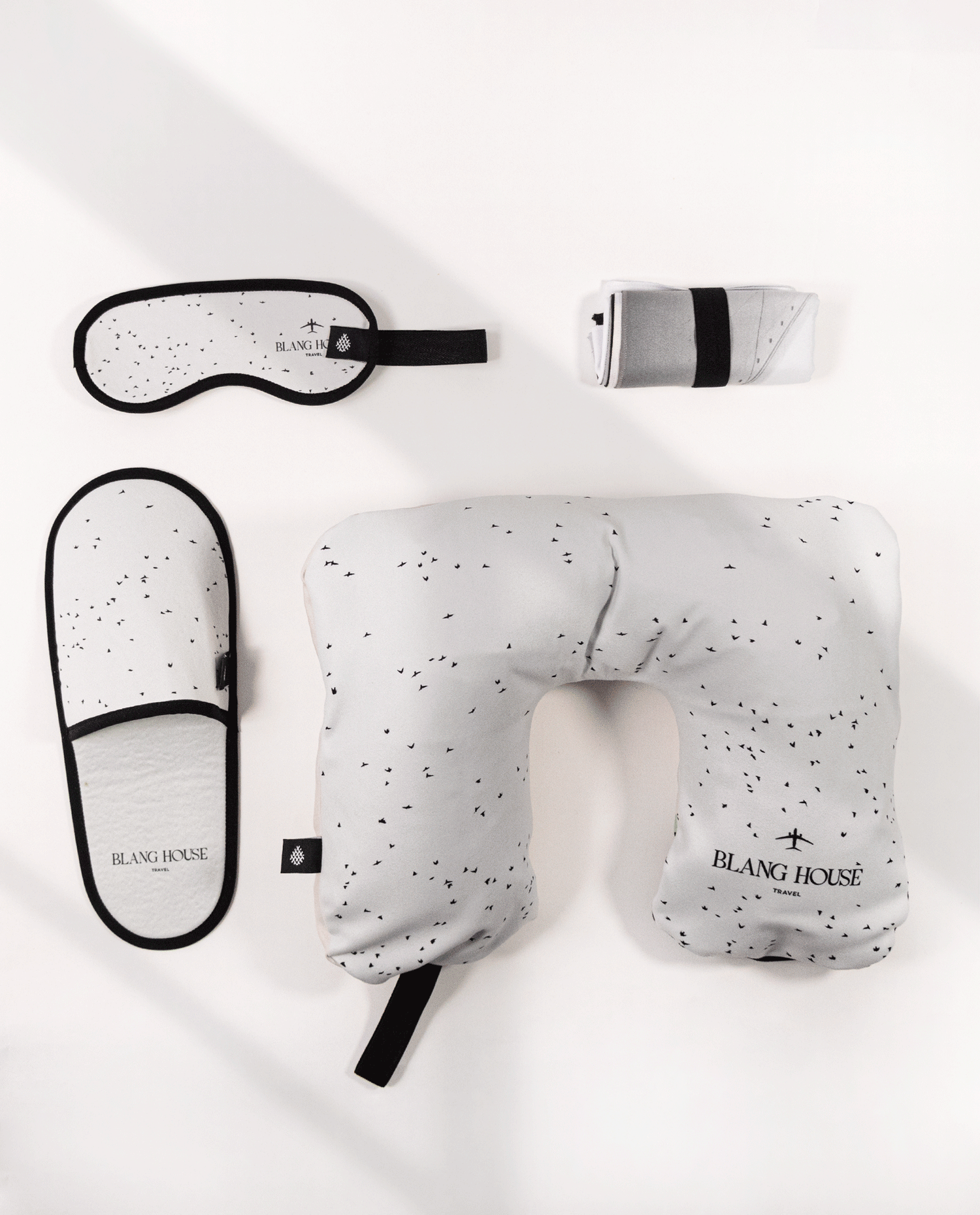 Enveloppant le pack complet de chaussons, coussin de nuque, masque, et même une petite serviette.