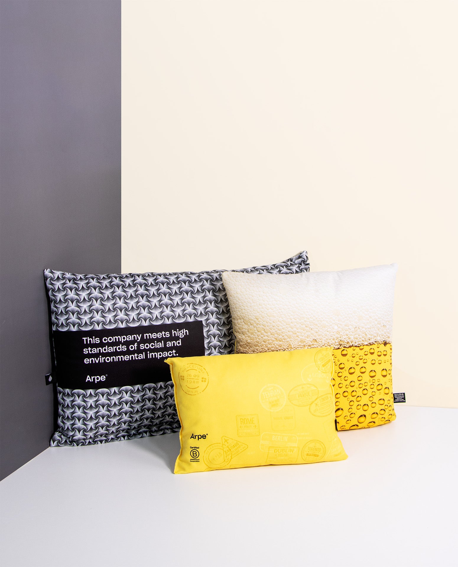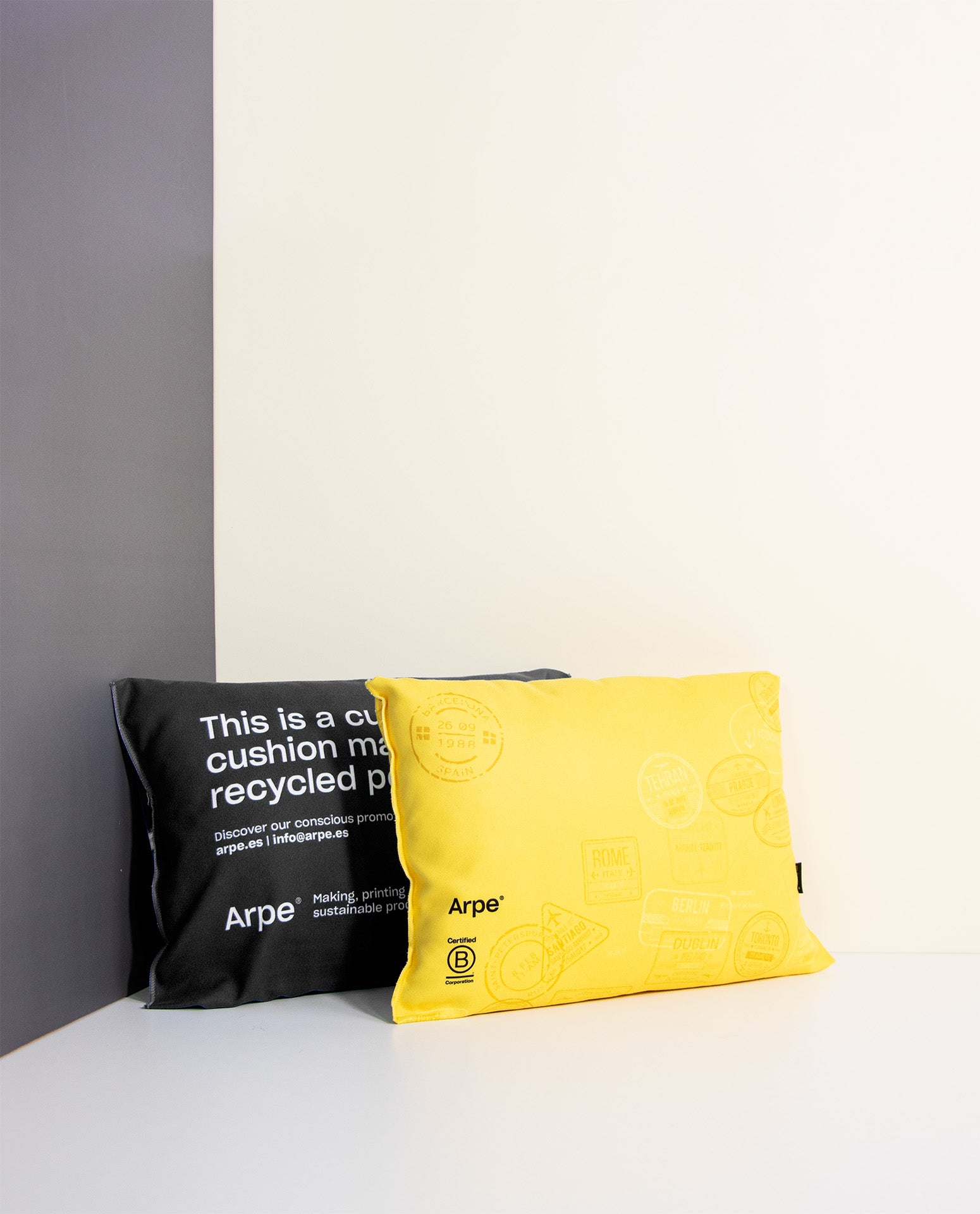 Hechos con hilo rPET post-consumo, nuestros cojines son un regalo promocional muy completo, ya que permiten personalizar toda la superficie exterior con mucho color y precisión. Además, están disponibles en cuatro tamaños diferentes y los envasamos internamente al vacío para ahorrar espacio al transportarlos.