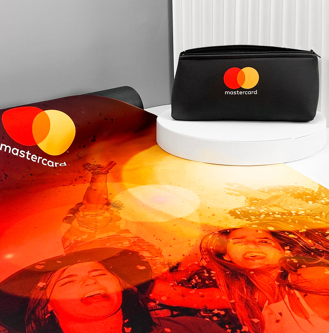 Neceseres acolchados 12x23cm y toallas de microfibra impresos digitalmente a dos caras como campaña publicitaria para festivales.