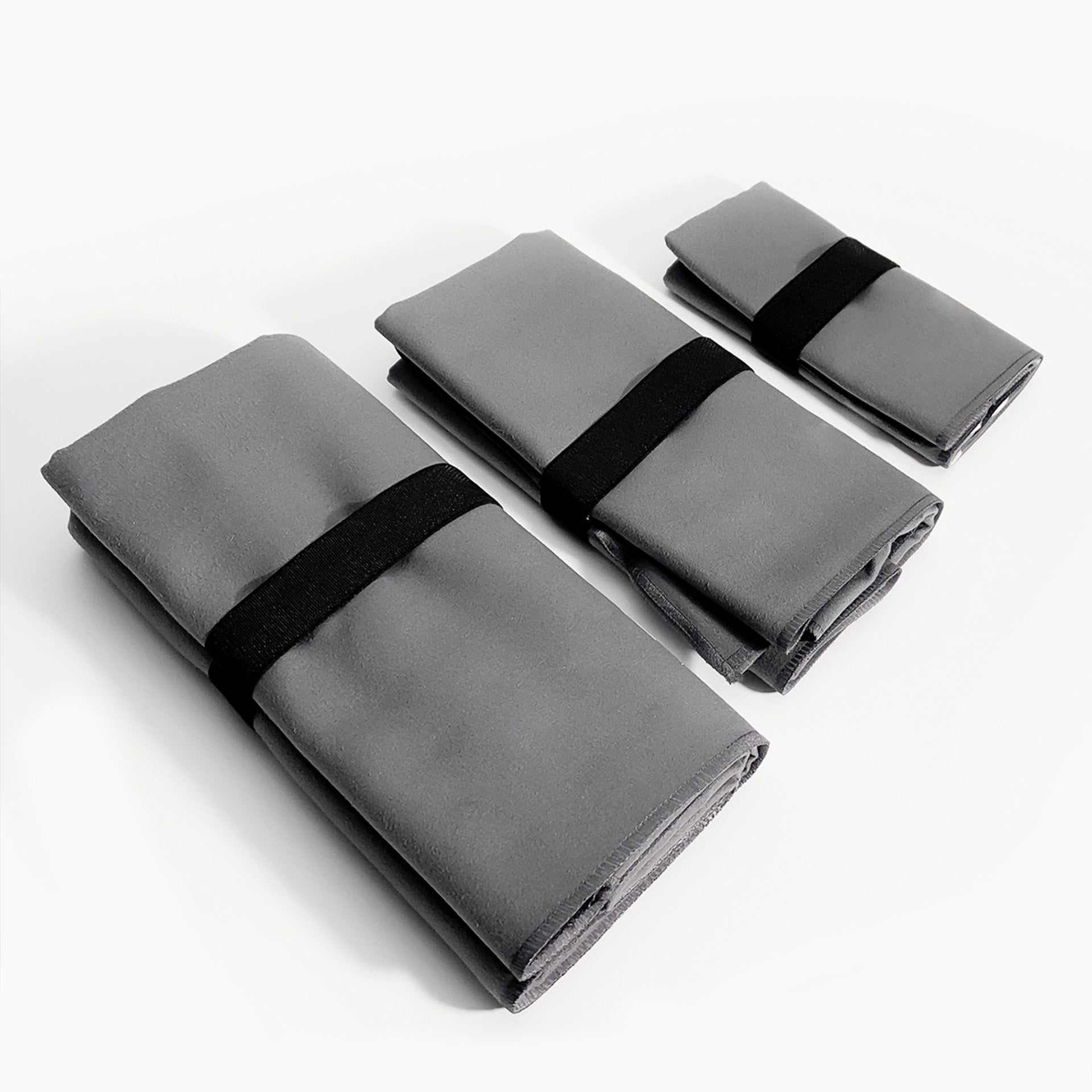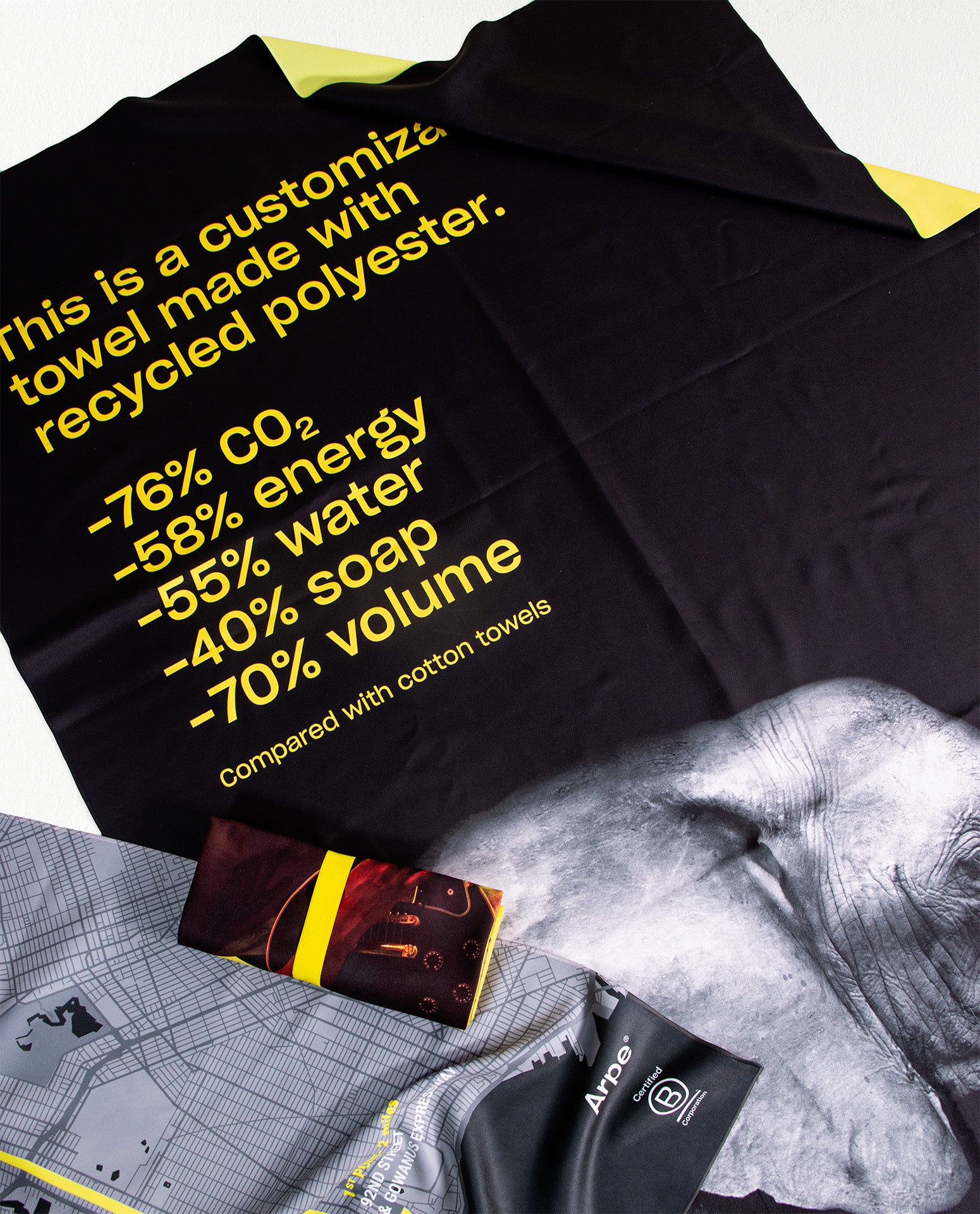 Hechas con hilo rPET post-consumo de alta calidad, las toallas de microfibra son nuestro producto estrella. Súper compactas, ligeras y de secado rápido, en un tejido suave muy diferente a cualquier otro. Además, comparadas con las toallas convencionales, los ahorros en el lavado son enormes: necesitan menos energía, agua y jabón, y ocupan un 70% menos de espacio.