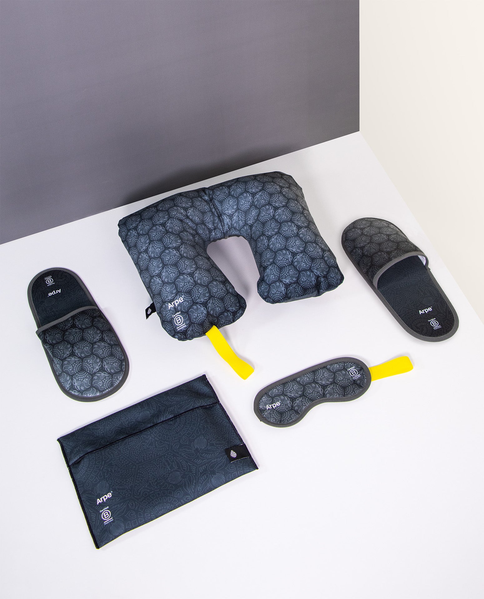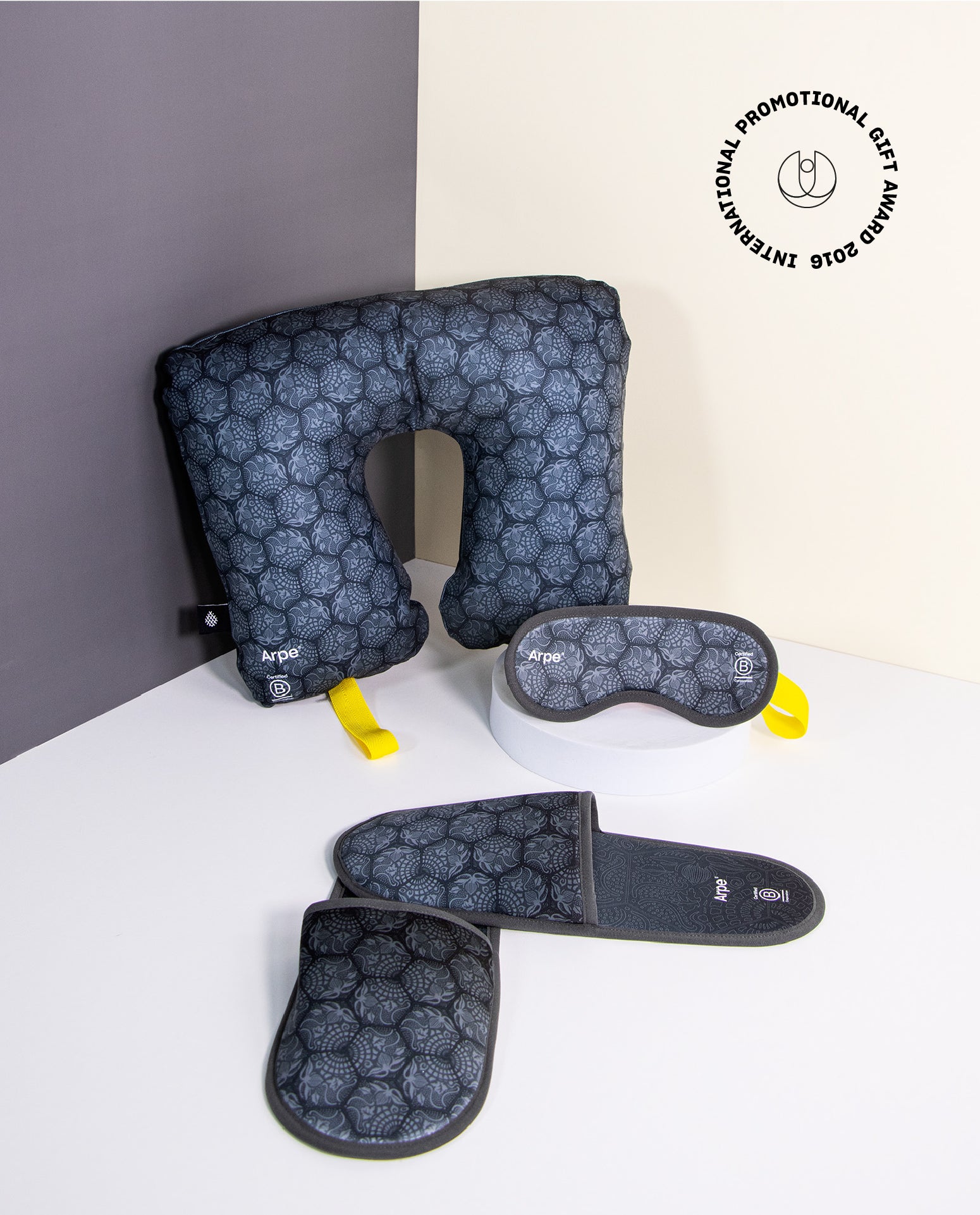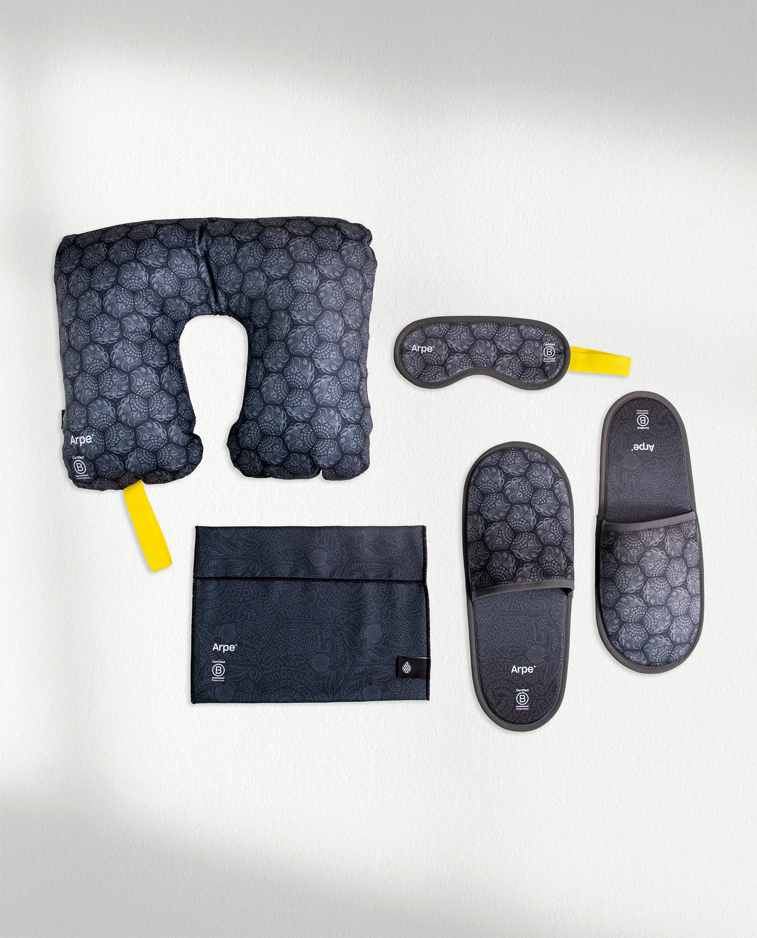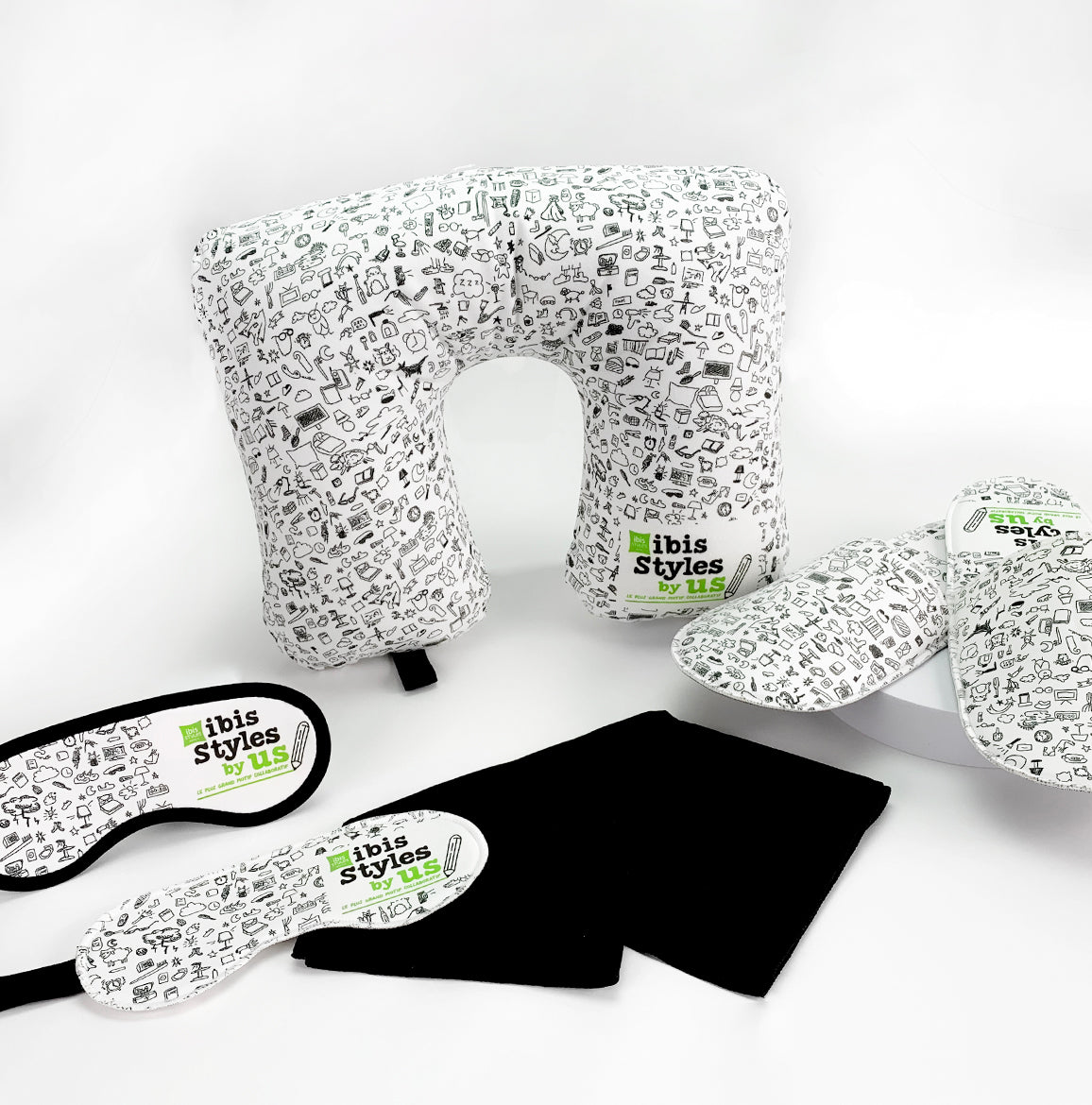 Pack de bienvenida para los huéspedes: zapatillas, antifaz y cojín cervical, todos impresos a doble cara.